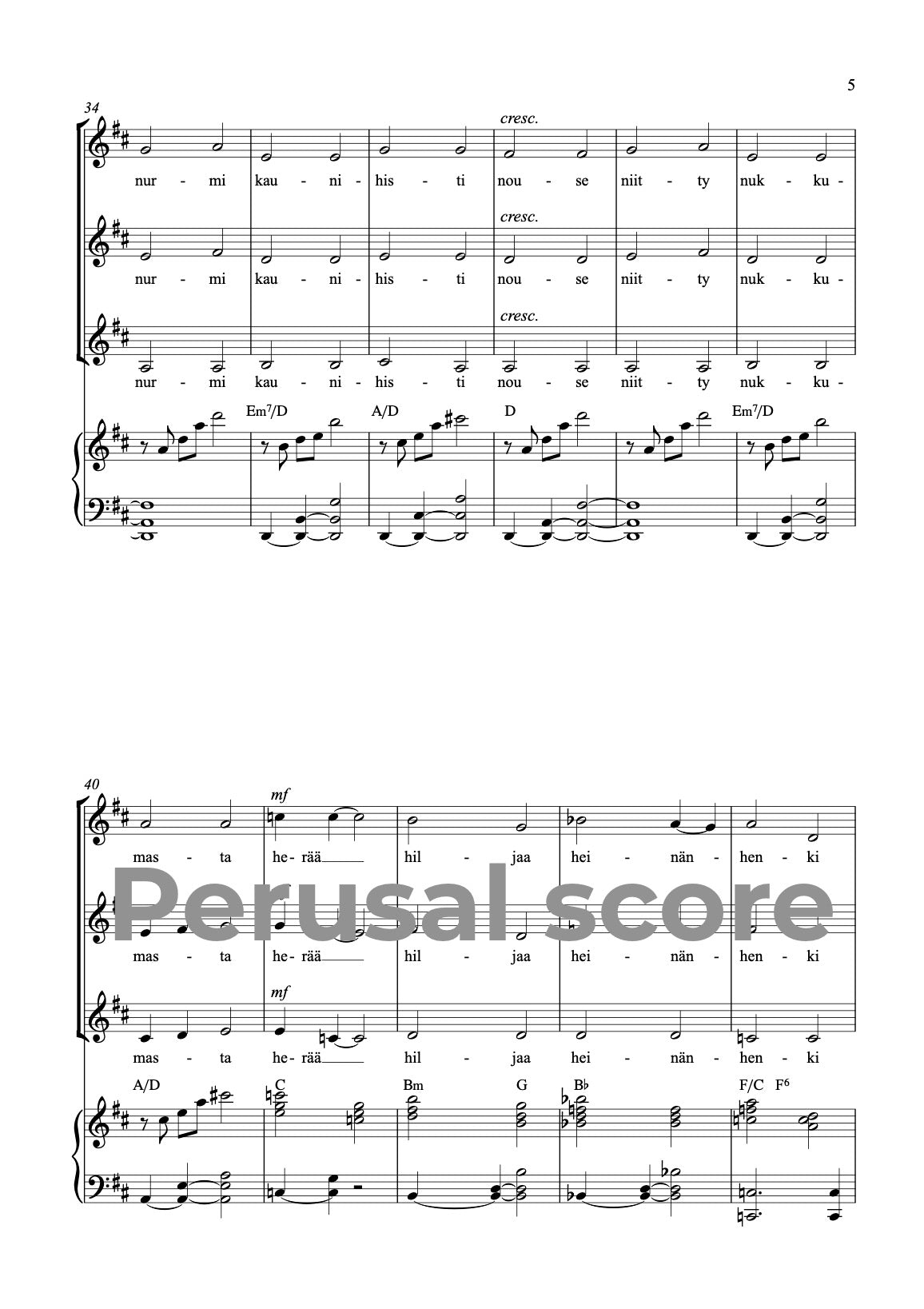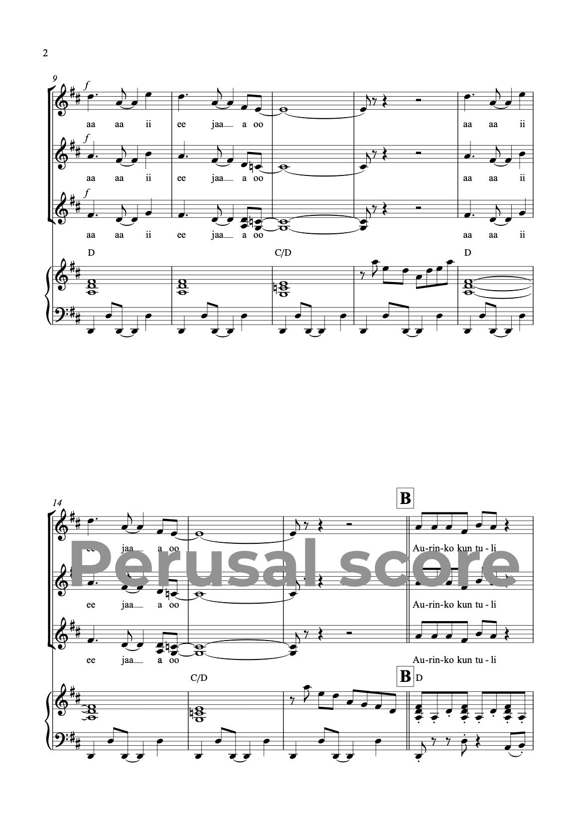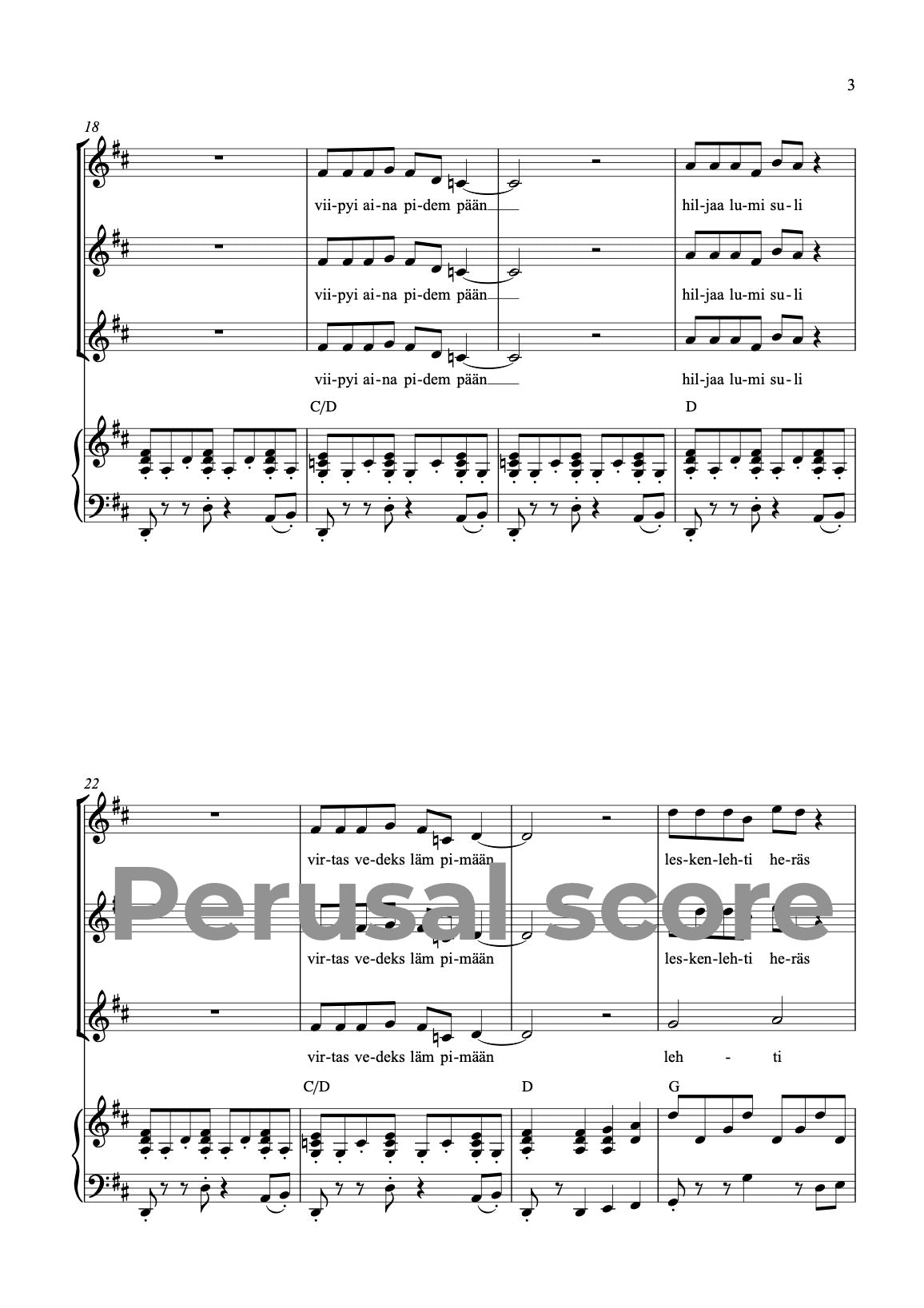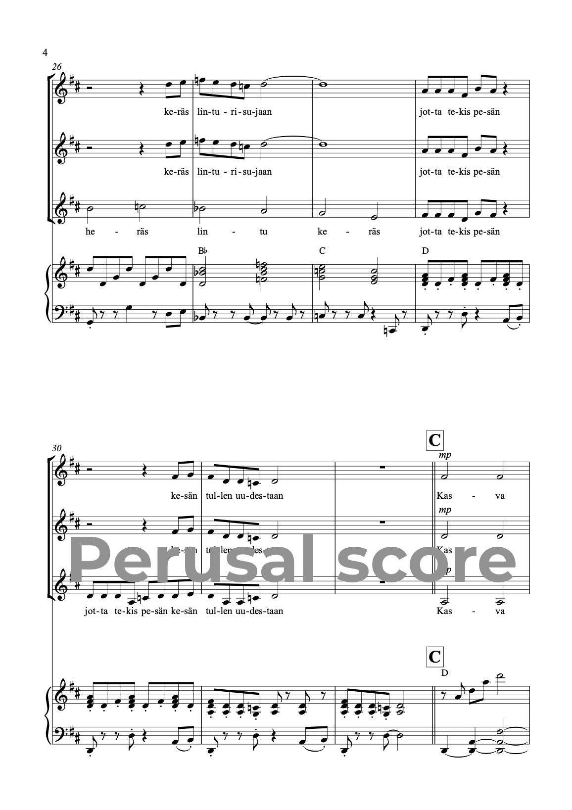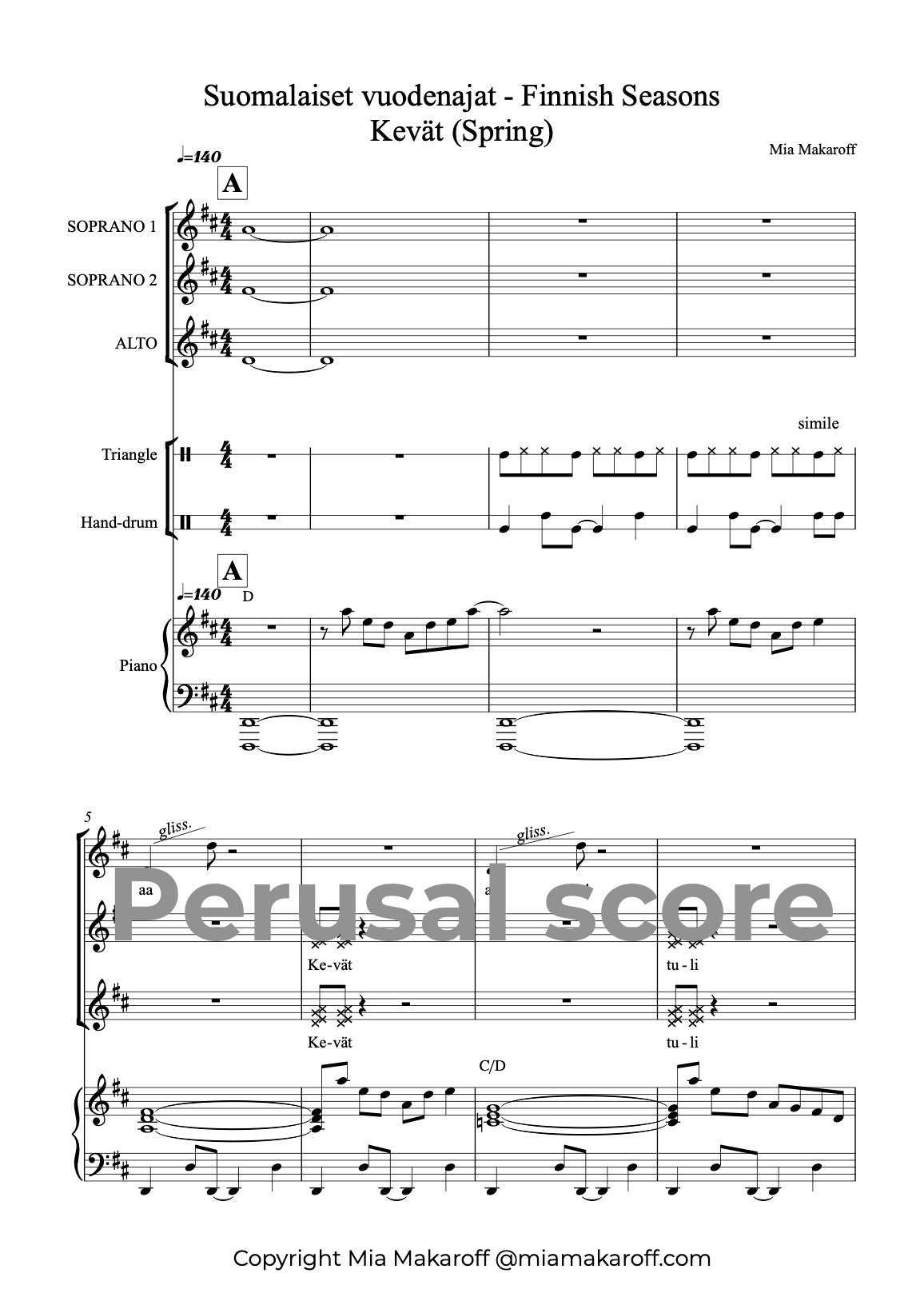 Music and lyrics: Mia Makaroff. This song is easy - medium difficult, energetic and happy song for children choirs, full of spring energy. This song is a part of a song cycle SUOMALAISET VUODENAJAT (FINNISH SEASONS) with parts 1. Talvi (Winter) 2. Kevät (Spring) 3. Kesä (Summer) and 4. Syksy (Autumn). Text is in Finnish. There is a recommendable choreography available for this song, made by Hanne Kauppinen. You can ask for choreography video from miamakaroff@gmail.com.
