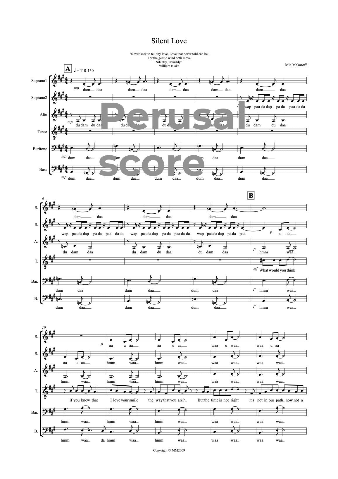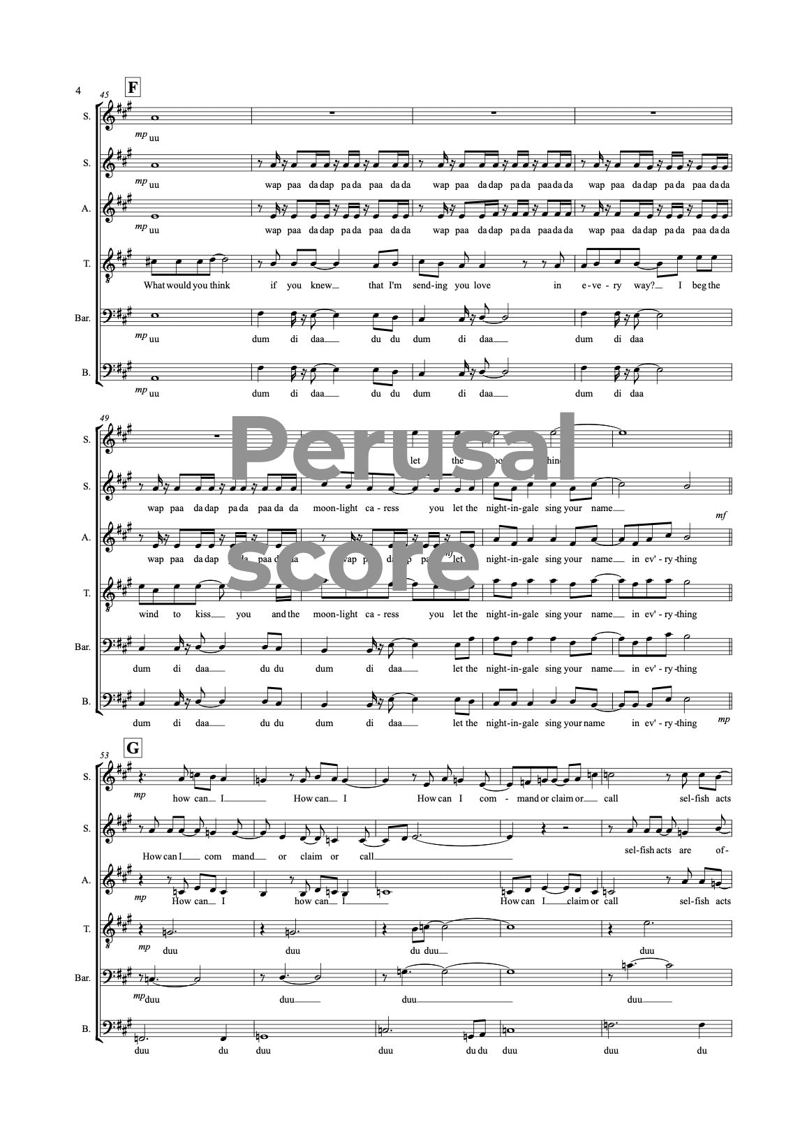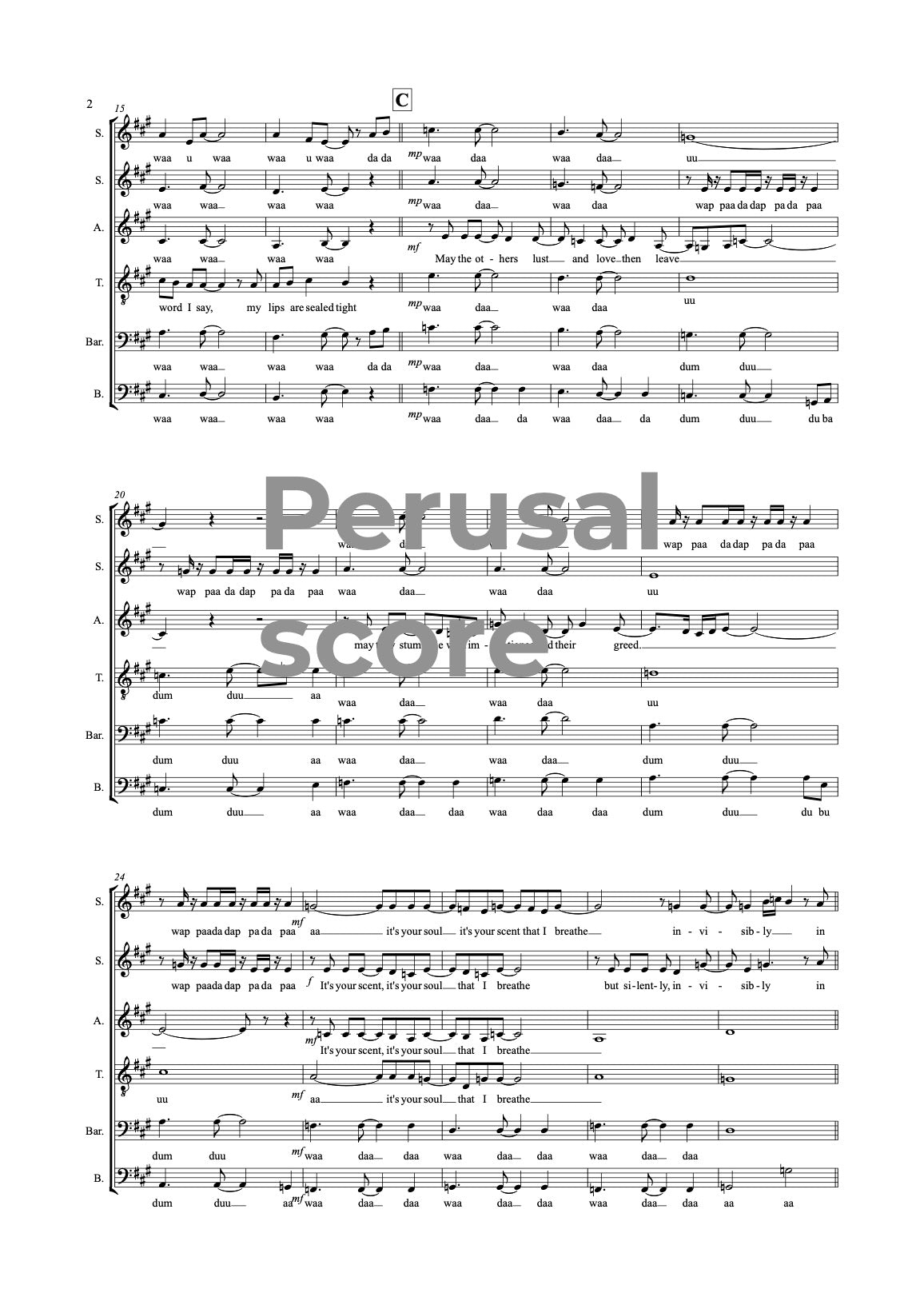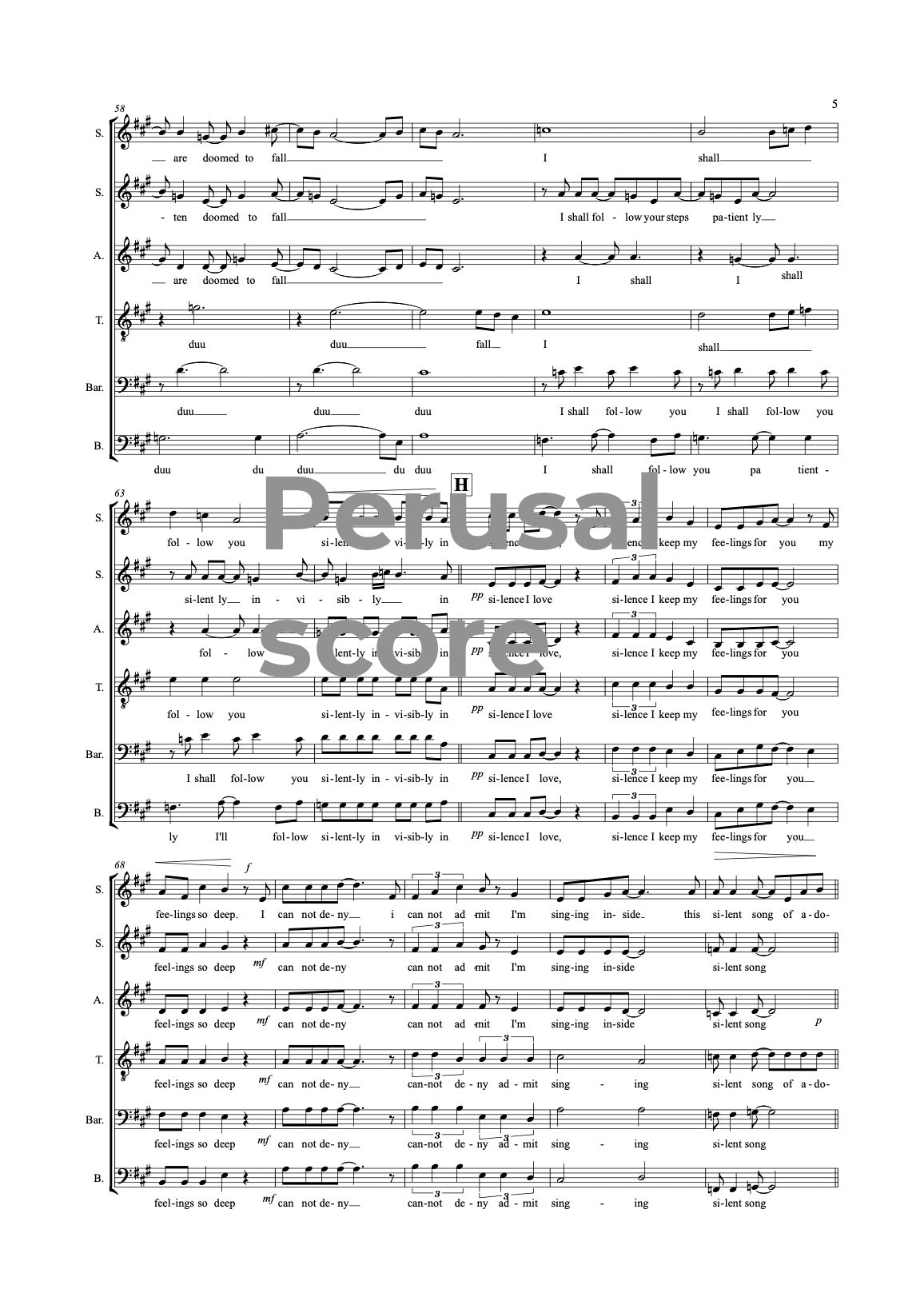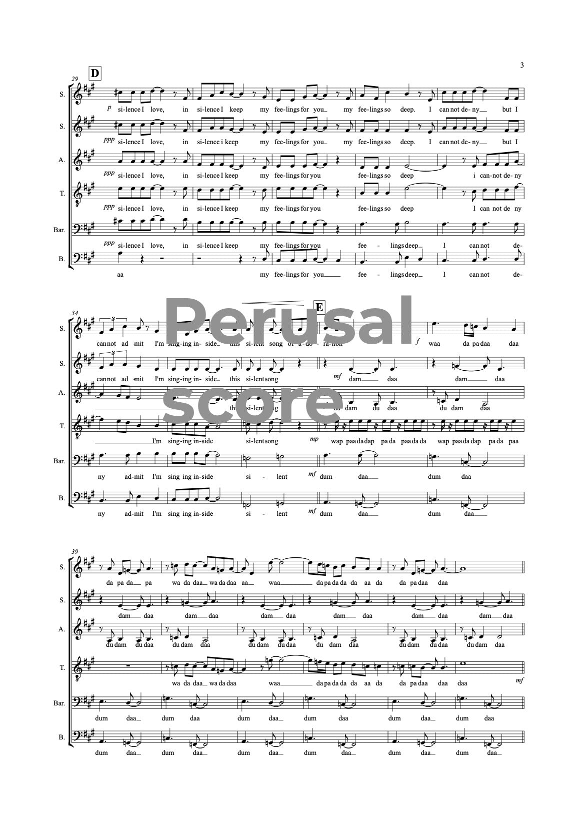 An introspective, haunting song about love that is kept in secret. Lyrics were written from an inspiration from a William Blake poem. This song was originally written for the King's Singers and recorded by them in their cd Swimming Over London. This song is thus also available for TTBBB.