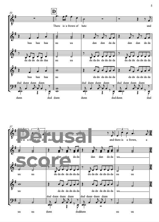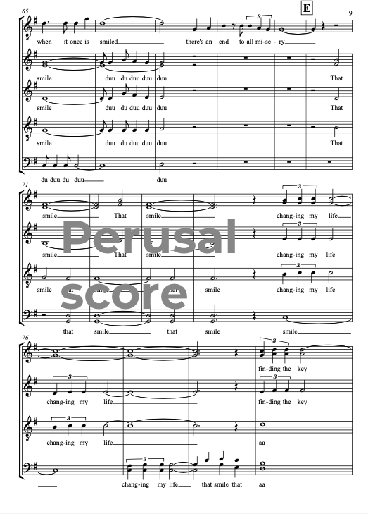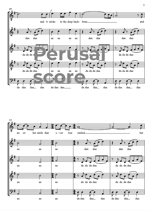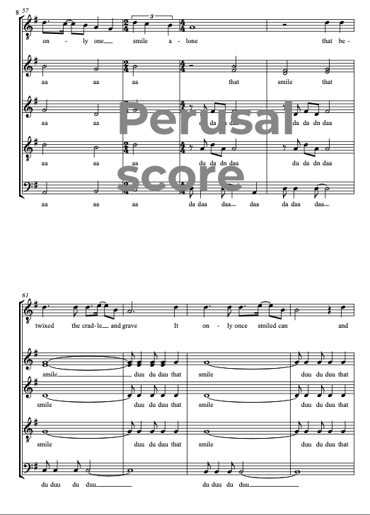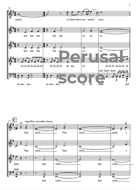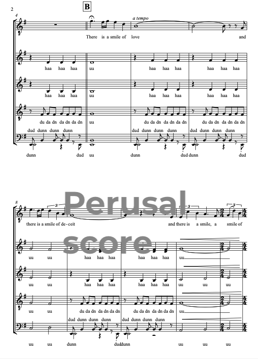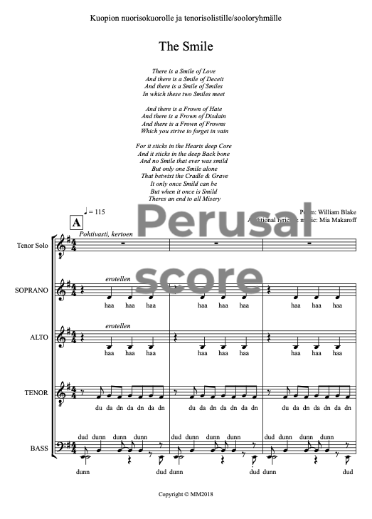 The classic poem of William Blake tells about that specific smile.... The new text, written by Mia, comments on Blake's poem. The bases sing here sometimes very low tones, also a very skilfull tenor/baritone solist is an advantage.