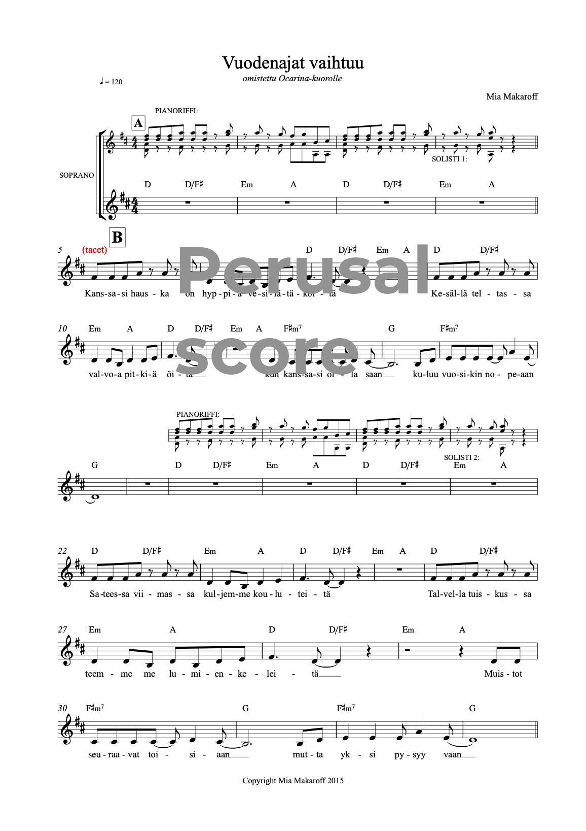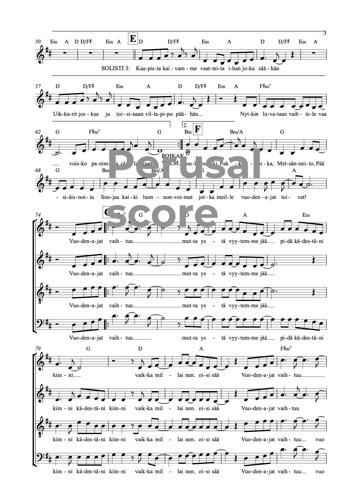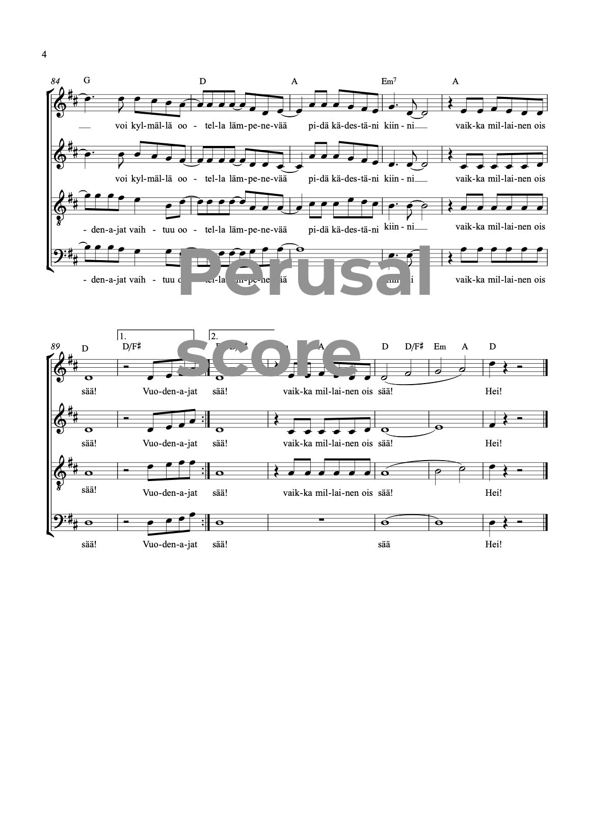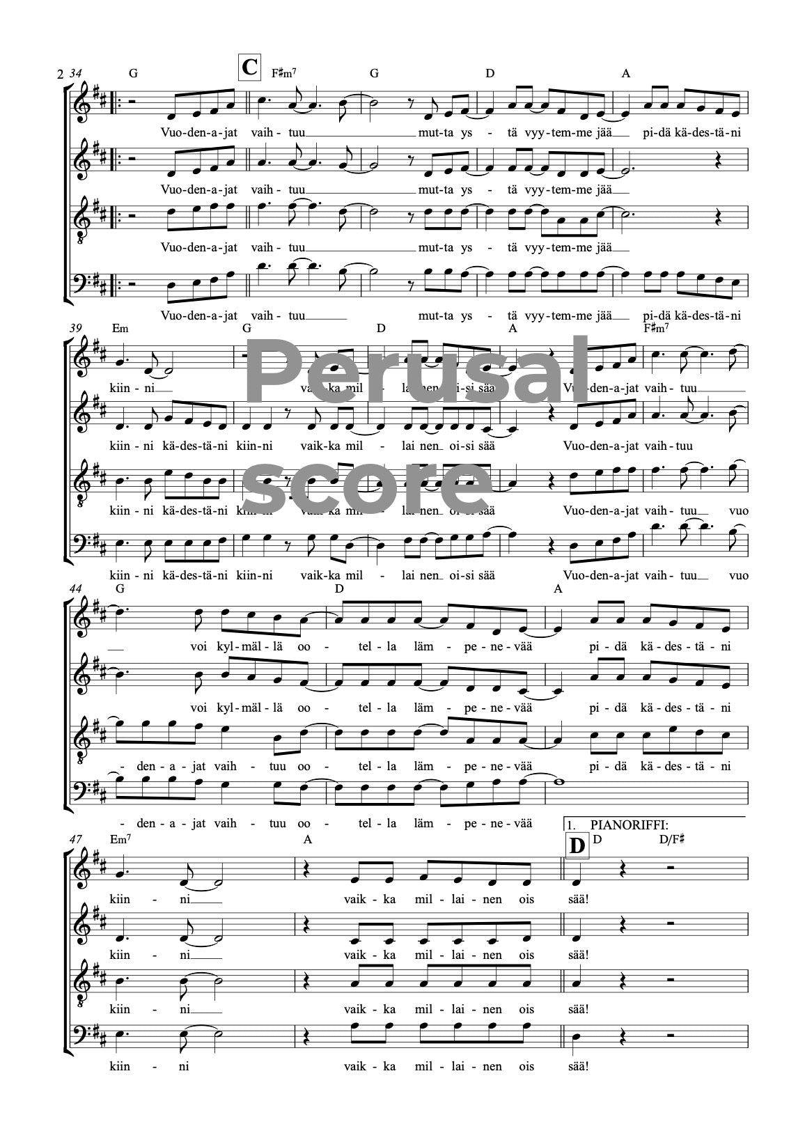 Kappale toimii säestettynä hyvin yksiäänisenä, kaksiäänisenä tai koko sekakuoroversiona. Oston yhteydessä saa sekä sekakuoroversion että melodianuotin, kummatkin sointumerkeillä.